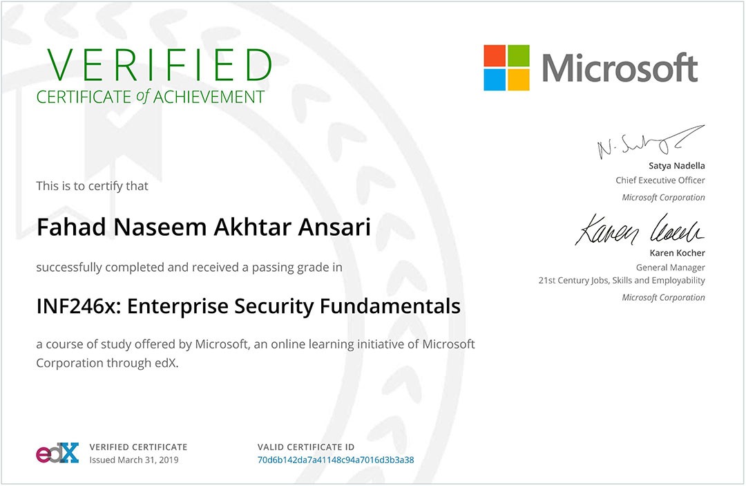 - Certified in Enterprise Security Fundamentals by Microsoft.